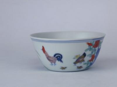 斗彩鸡缸杯,明成化,高3.4cm,口径8.3cm,足径4.3cm杯敞口微撇,口下渐敛,平底,卧足。杯体小巧,轮廓..